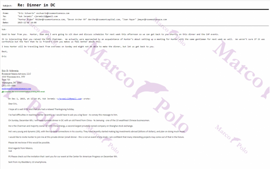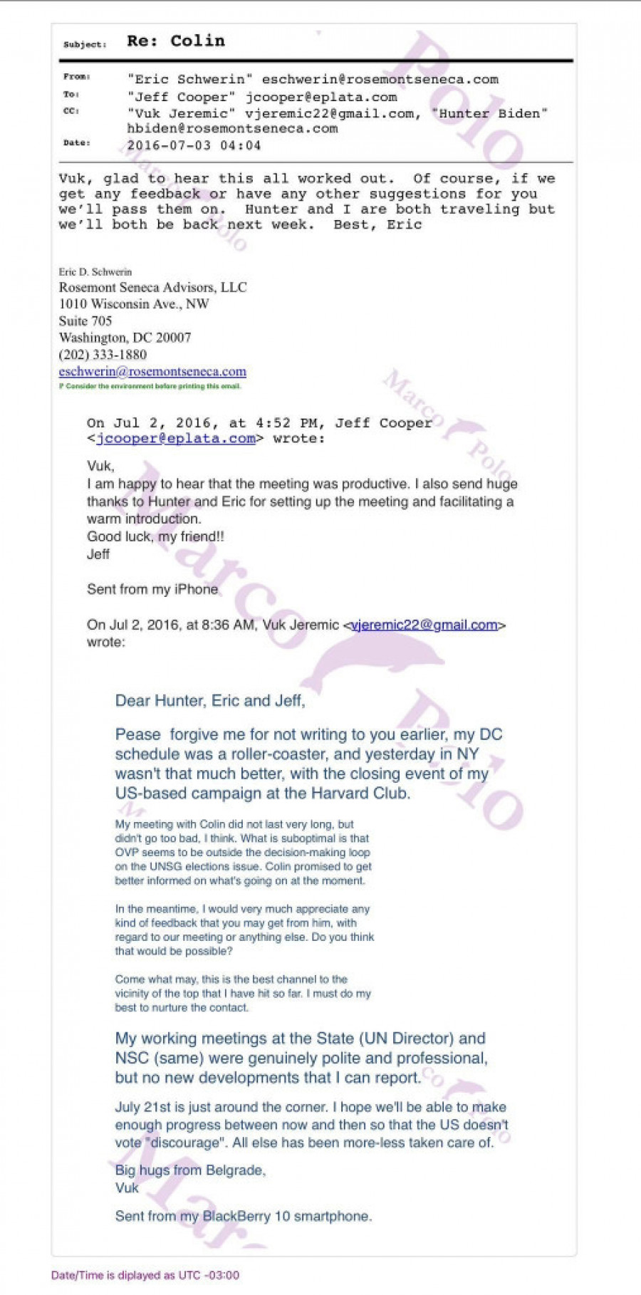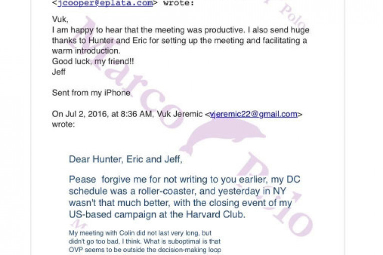 Prema dokumentaciji koju detaljno možete pogledati u galeriju prinskrinova, Jeremić je svojevremeno nudio biznis Hanteru Bajdenu, a sve u cilju da se domogne fotelje generalnog sekretara UN.