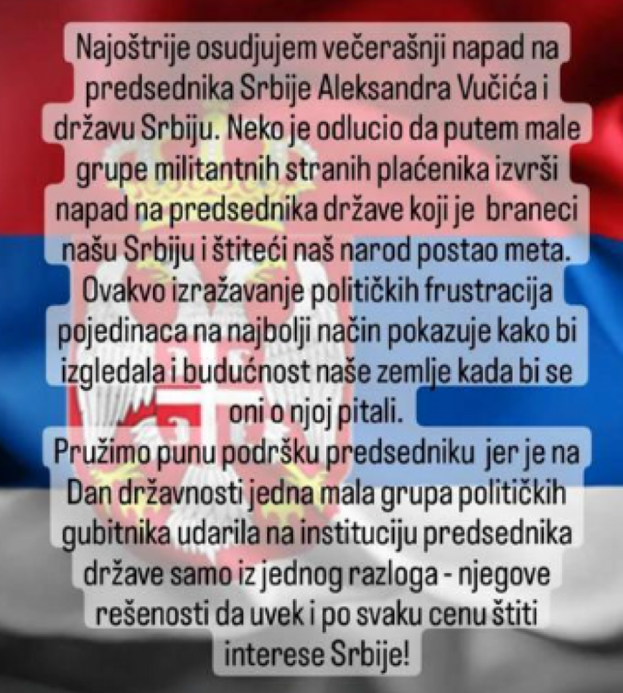 - Najoštrije osuđujem večerašnji napad na predsednika Srbije Aleksandra Vučića i državu Srbiju. Neko je odlučio da putem male grupe militantnih stranih plaćenika izvrši napad na predsednika države koji je braneći našu Srbiju i štiteći naš narod postao meta. Ovakvo izražavanje političkih frustracija pojedinaca na najbolji način pokazuje kako bi izgledala budućnost naše zemlje kada bi se oni o njoj pitali. Pružimo punu podršku predsedniku jer je na Dan državnosti jedna mala grupa političkih gubitnika udarila na instituciju predsednika države samo iz jednog razloga - njegove rešenosti da uvek i po svaku cenu štiti interese Srbije! - napisala je sekretarka na svom Instagram nalogu i na taj način oštro osudila ove namere, kako je navela, militantne grupe stranih plaćenika.