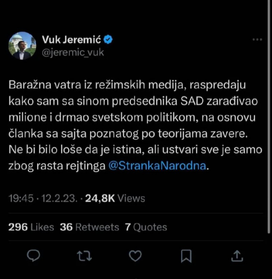 – Baražna vatra iz režimskih medija, raspredaju kako sam sa sinom predsednika SAD zarađivao milione i drmao svetskom politikom, na osnovu članka sa sajta poznatog po teorijama zavere. Ne bi bilo loše da je istina, ali ustvari sve je samo zbog rasta rejtinga @StrankaNarodna – napisao je samouvereno Jeremić.