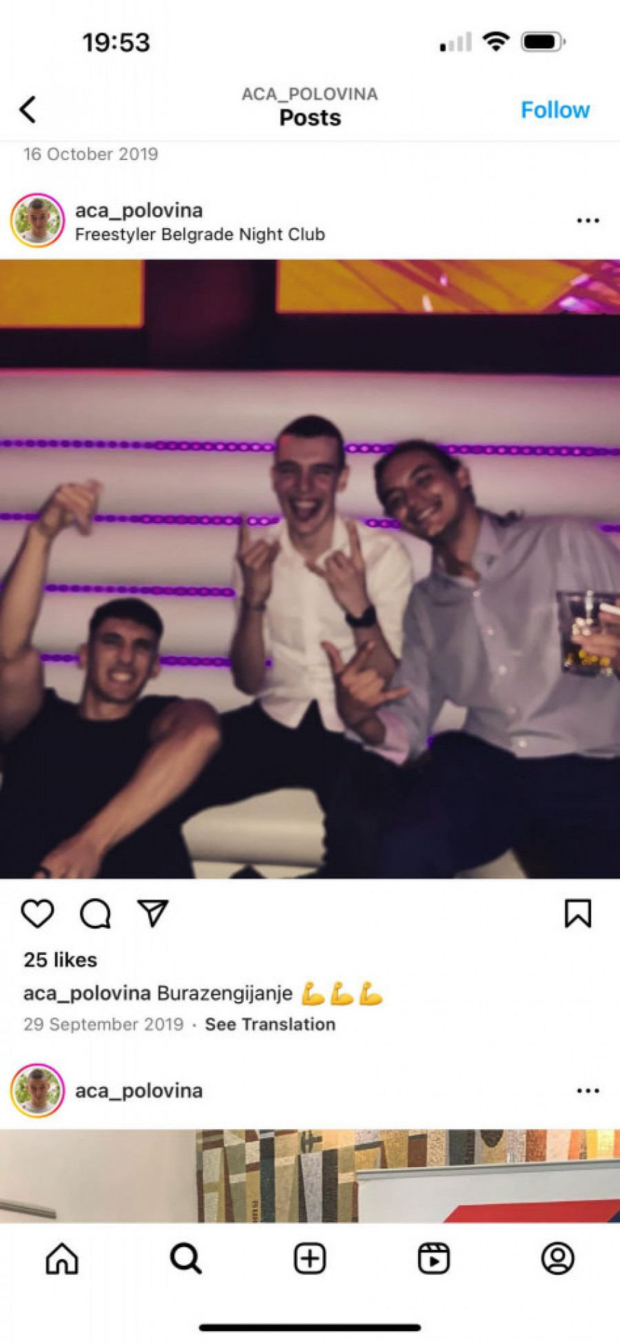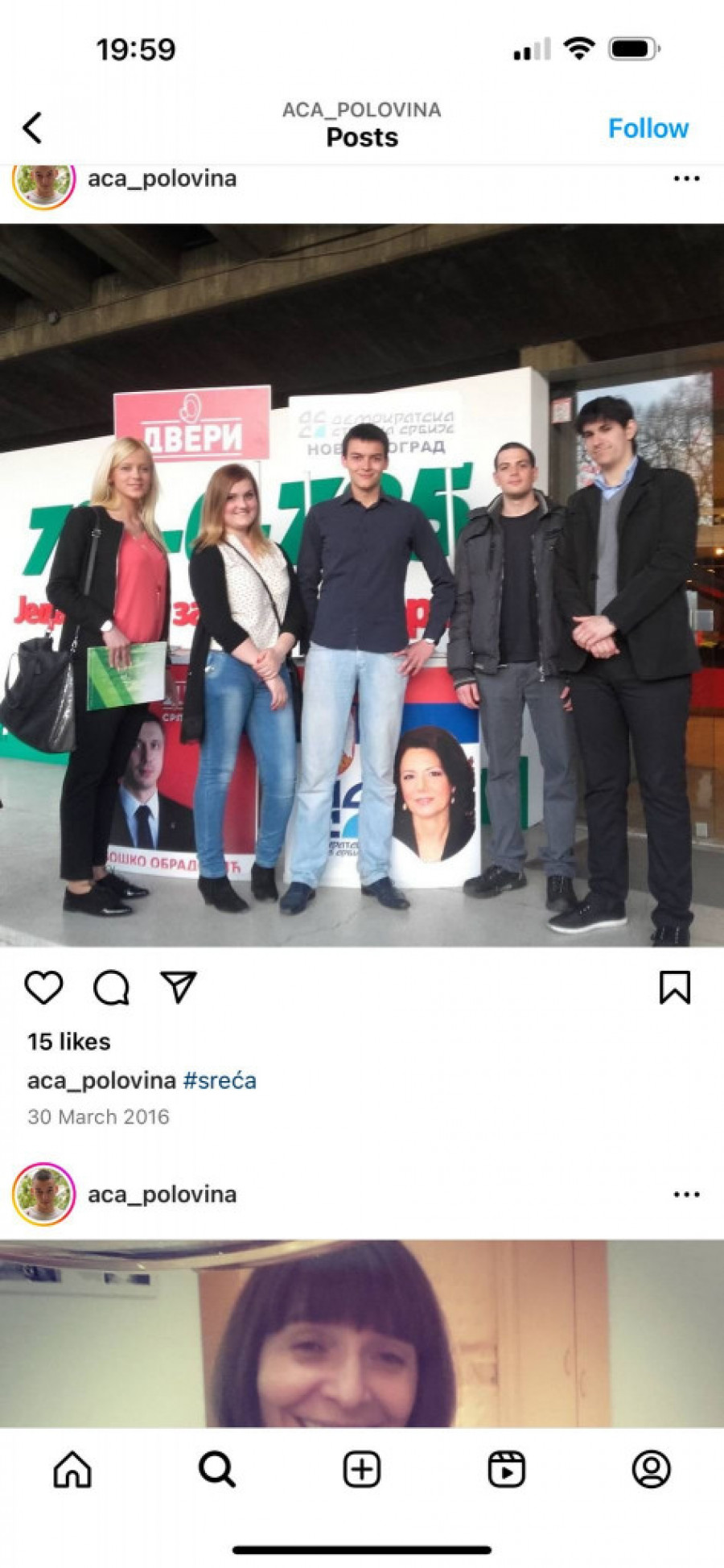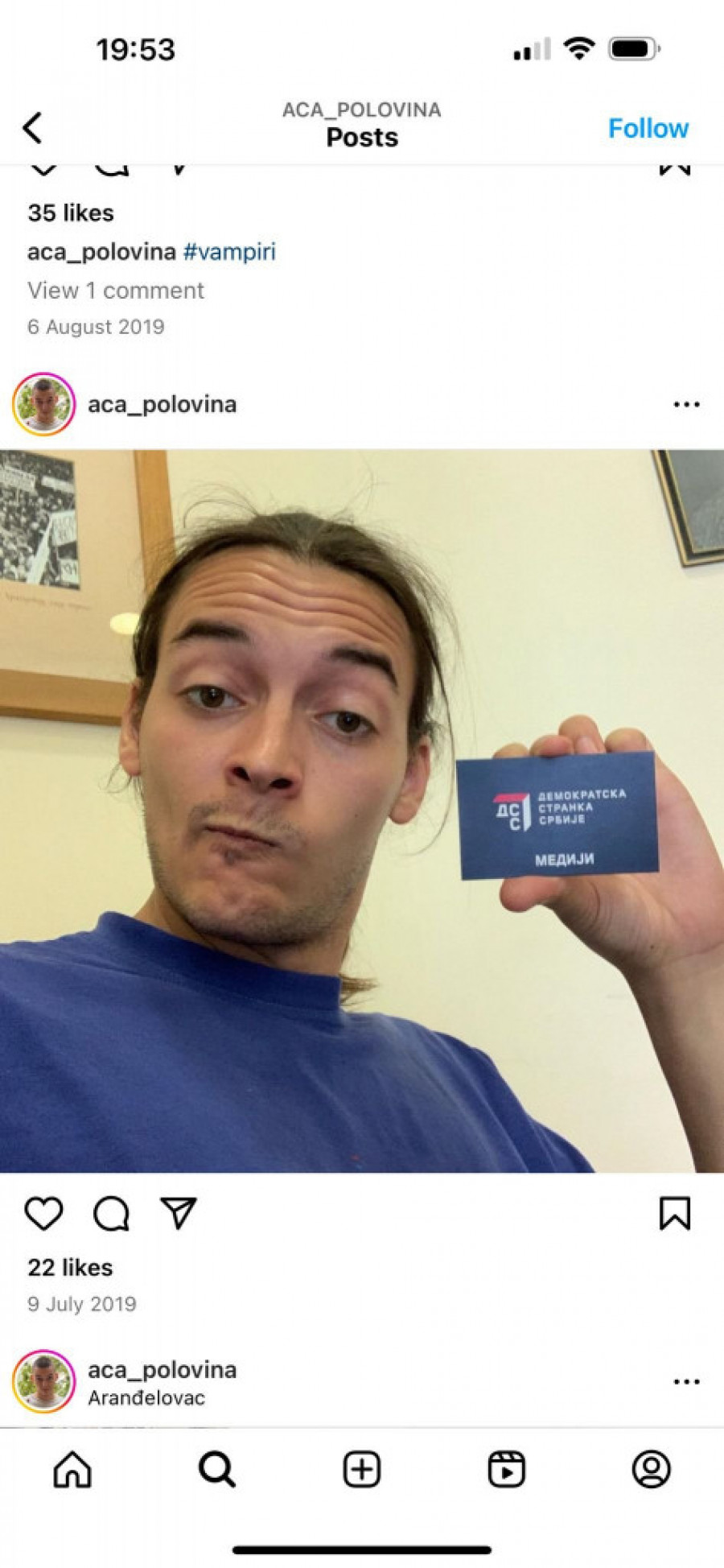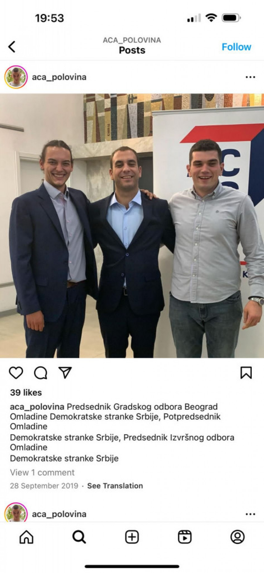 Njegove fotografije lajkuje zvaničan nalog kolaicije POKS (ogranak Grocka i Novi Beograd), što pokazuje da otvoreno stoje iza stavova koje promoviše ovaj mladić, koji na društvenim mrežama osim što promoviše Demokratsku stranku Srbije i linč, takođe promoviše i alkohol, pa se na većini njegovih fotografija može videti upravo to.