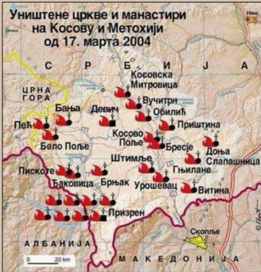 Posebna meta bili su duhovno nasleđe i hramovi srpskog naroda. Međunarodni tužioci i sudije na Kosovu i Metohiji procesuirali su sedam slučajeva uništavanja crkava i 67 osoba je osuđeno. Pogrom albanskih ekstremista nad Srbima 17, 18. i 19 marta 2004. na Kosovu i Metohiji osudili su tada Savet bezbednosti UN, kao i Evropska unija.