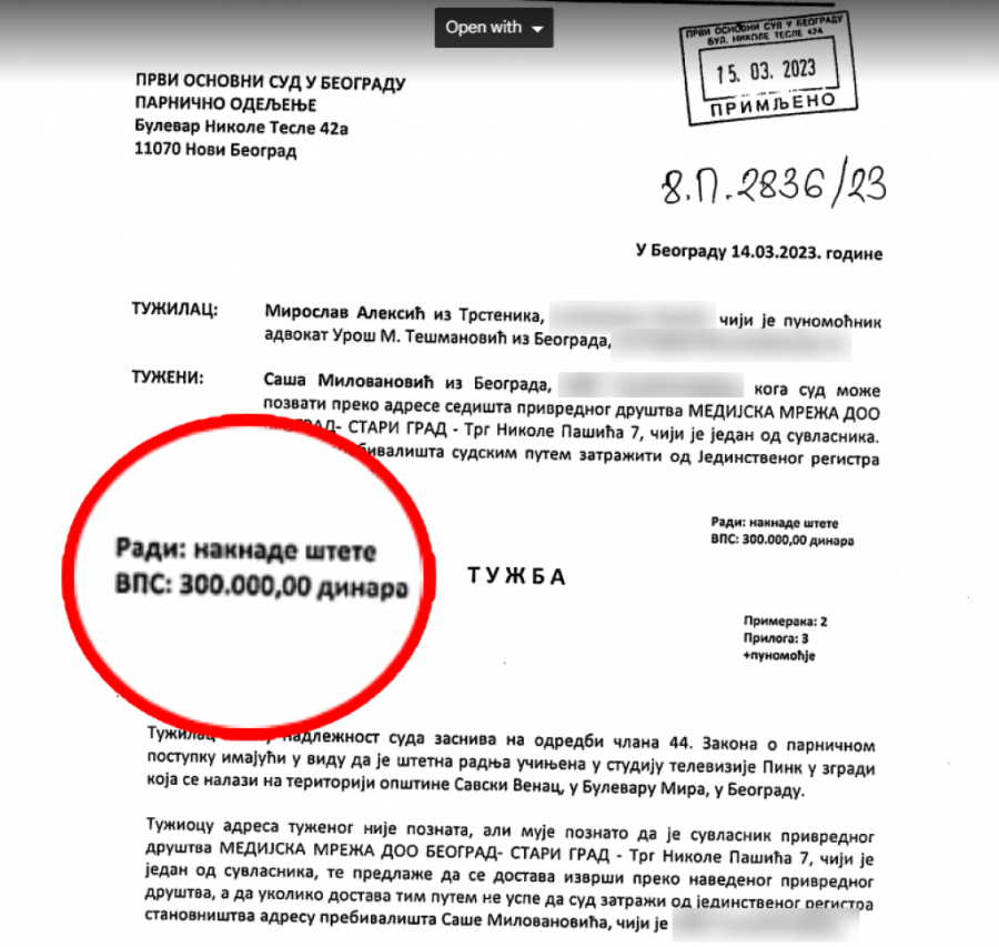 Povod za tužbu kojom Aleksić traži čak 300.000 dinara nematerijalne štete "za pretrpljene duševne bolove zbog povrede dostojanstva, ugleda i časti" je Milovanovićevo gostovanje na televiziji Pink 13. februara ove godine.