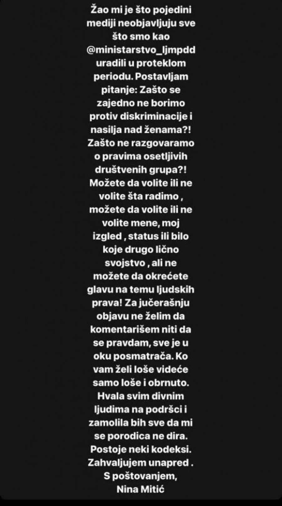 - Žao mi je što pojedini mediji neobjavljuju sve što smo kao ministarstvo uradili u proteklom periodu. Postavljam pitanje: zašto se zajedno ne borimo protiv diskriminacije i nasilja nad ženama? Zašto ne razgovoramo o pravima osetljivih društvenih grupa? Možete da volite ili ne volite šta radimo, možete da volite ili ne volite mene, moj izgled, status ili bilo koje drugo lično svojstvo , ali ne možete da okrećete glavu na temu ljudskih prava! Za jučerašnju objavu ne želim da komentarišem niti da se pravdam, sve je u oku posmatrača. Ko vam želi loše videće samo loše i obrnuto. Hvala svim divnim ljudima na podršci i zamolila bih sve da mi se porodica ne dira - napisala je Mitićeva na Instagramu.