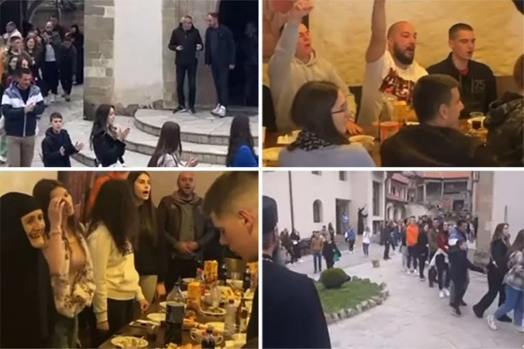 Pevajući iz sveg glasa, mladići i devojke iz Crne Gore, kružili su oko manastira i aplaudirali. Nizale su se stare srpske pesme, a na snimku koji se pojavio u javnosti vidi se da su gosti iz Nikšića pevali i u manastirskom konaku.