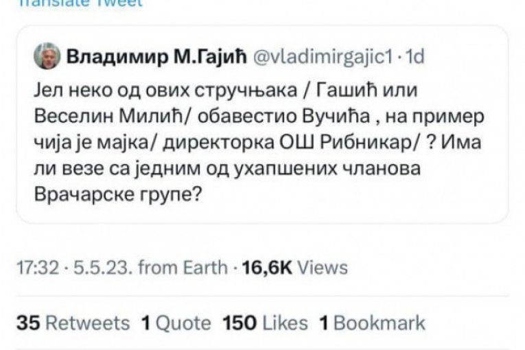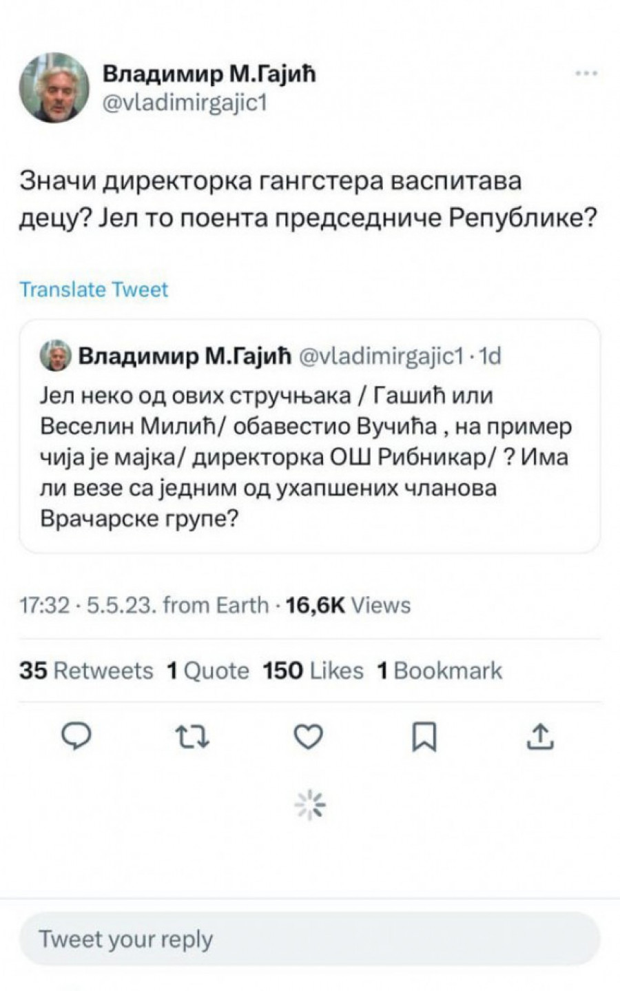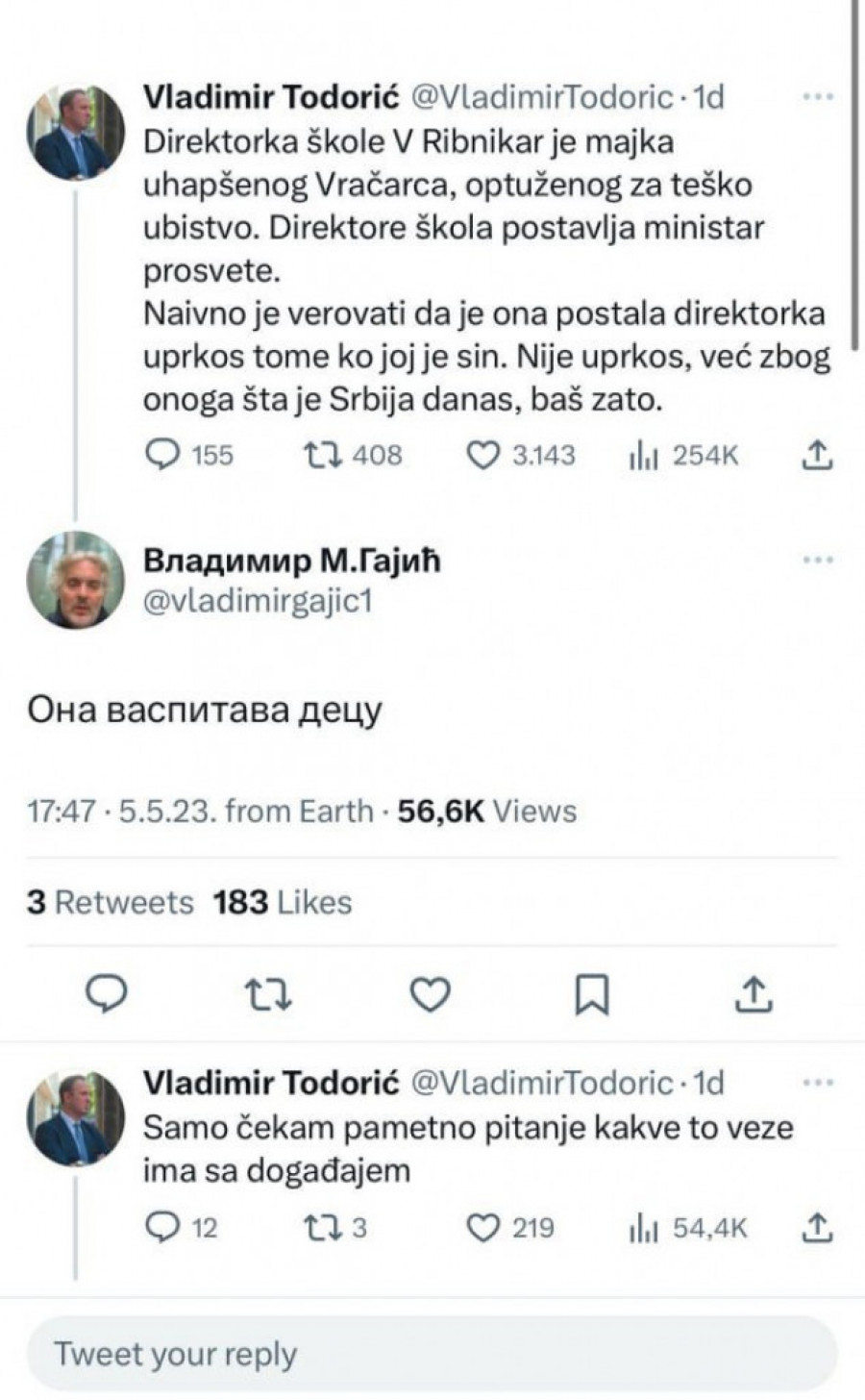 - Direktorka škole V Ribnikar je majka uhapšenog Vračarca, optuženog za teško ubistvo. Direktore škola postavlja ministar prosvete. Naivno je verovati da je ona postala direktorka uprkos tome ko joj je sin. Nije uprkos, već zbog onoga šta je Srbija danas, baš zato - stoji u objavi Vladimira Todorića.