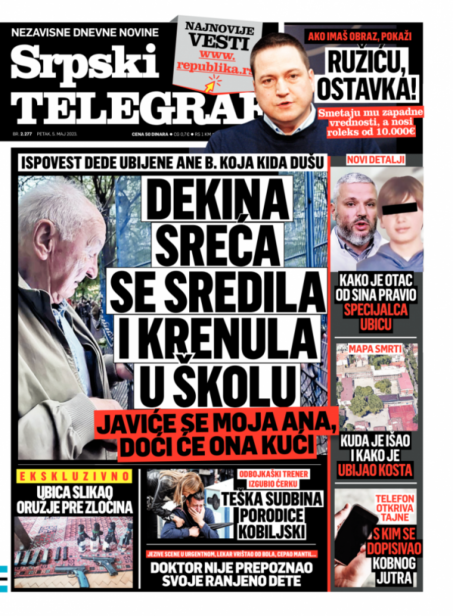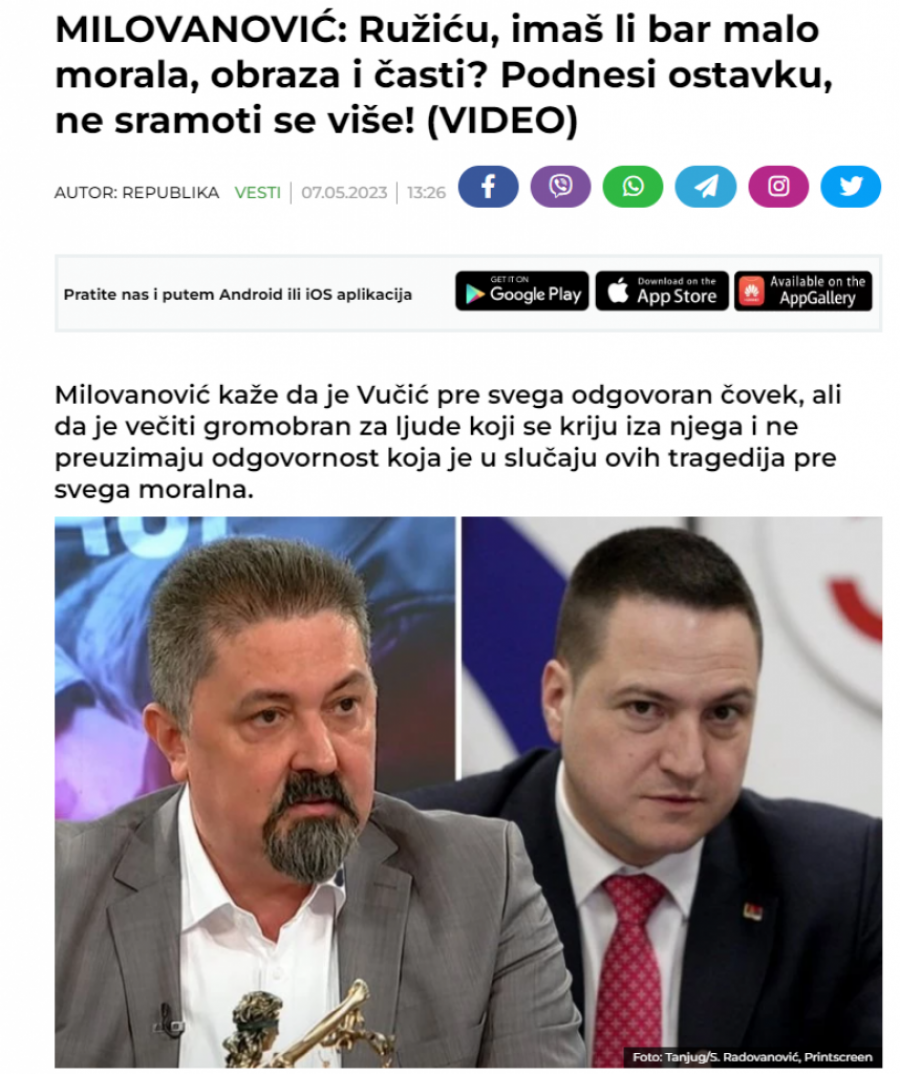- Ministar Ružić je trebalo da podnese ostavku prvog dana, ako ništa drugo iz moralnih razloga, stradala su deca u njegovom resoru, u školi. Umesto da odmah podnese ostavku, a ostavka se podnese tako što se ne pita ni premijer, nit se pita predsednik partije Dačić, nego se podnese ostavka iz moralnih razloga, ne ulazeći u to da li je on kriv ili nije kriv, i da nema njegove krivice, u resoru gde su stradala deca, ti kao ministar moraš da imaš moralni čin da bi ponudio ostavku - naglasio je danas u jutarnjem programu kod Jovane Jeremić Urednik Srpskog telegrafa Saša Milovanović.