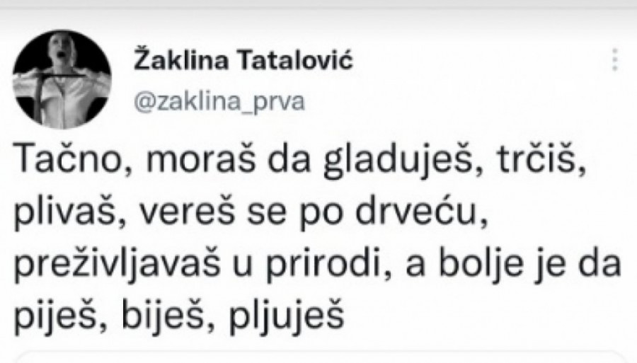 - Tačno moraš da gladuješ, trčiš, plivaš, vereš se po drveću. Preživljavaš u prirodi, a bolje je da piješ, biješ, pljuješ... - napisala je ova novinarka.