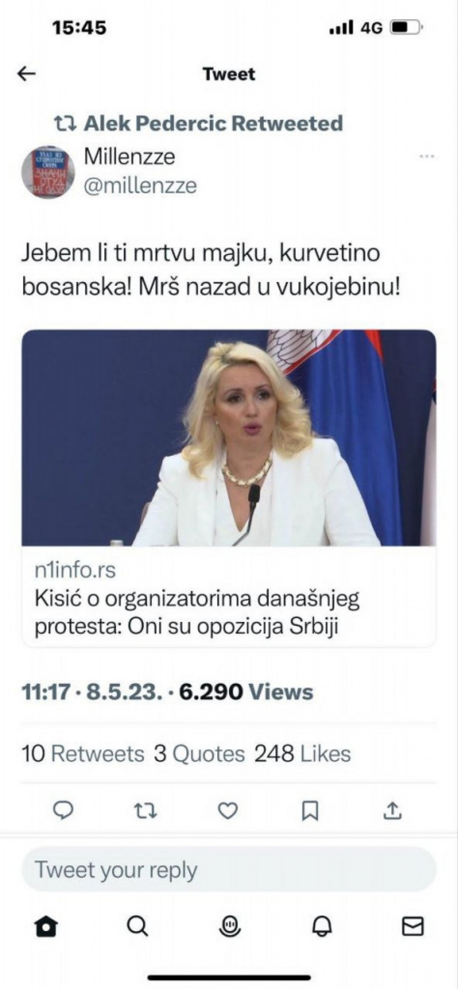 - Je*em li ti mrtvu majku, ku*vetino bosanska! Mrš nazad u vukoje*inu - glasila je užasavajuća poruka na društvenoj mreži.