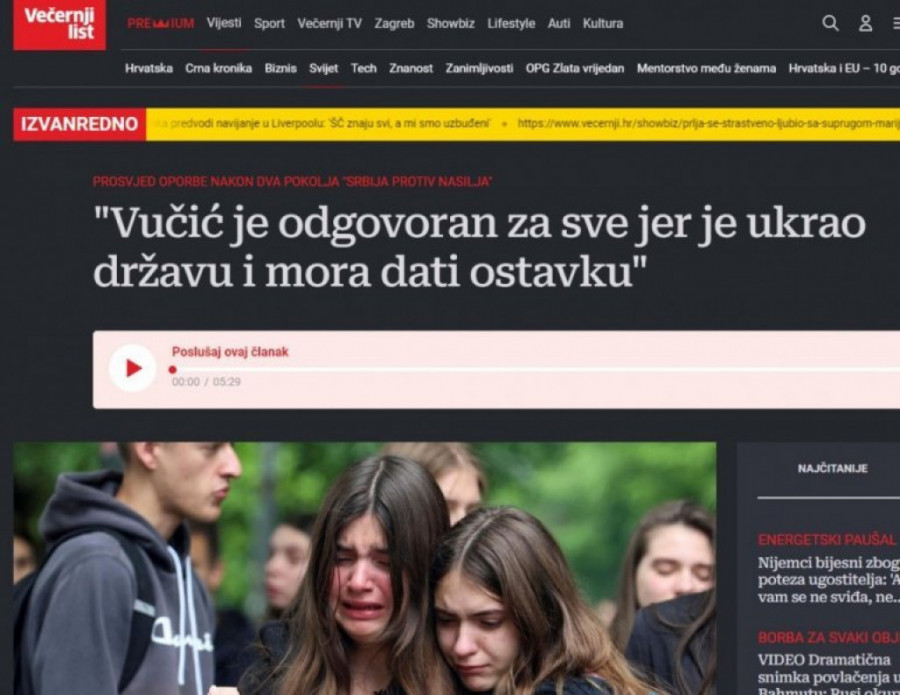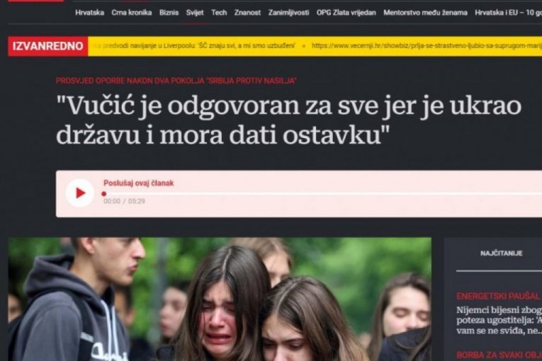 Hrvatski portali "Index.hr" i "Jutarnji.hr" objavljuju autorske tekstove u kojima brutalno napadaju predsednika Vučića optužujući ga za tragedije na Vračaru i u okolini Mladenovca.