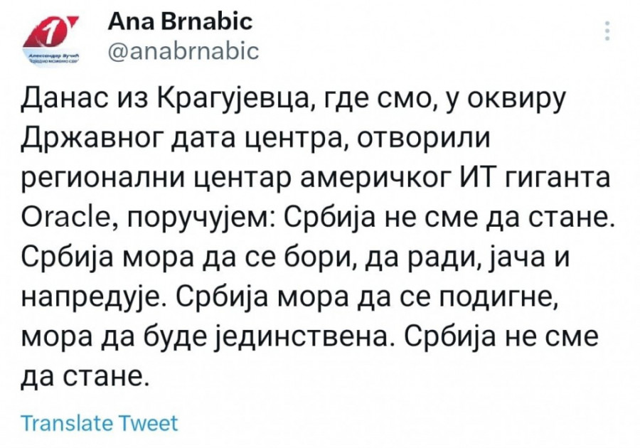- Danas iz Кragujevca, gde smo, u okviru Državnog data centra, otvorili regionalni centar američkog IT giganta Oracle, poručujem: Srbija ne sme da stane. Srbija mora da se bori, da radi, jača i napreduje. Srbija mora da se podigne, mora da bude jedinstvena. Srbija ne sme da stane - napisala je Ana Brnabić na Tviteru.
