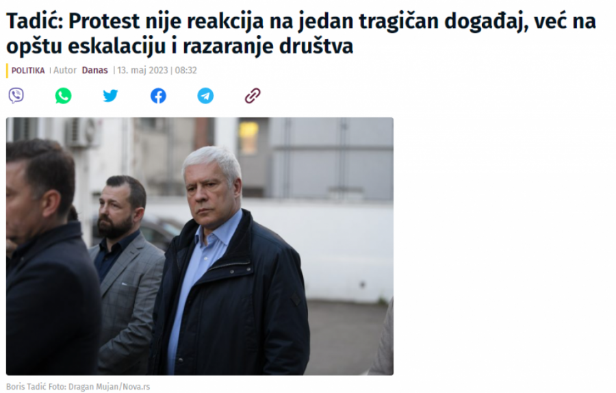 Predsednik Socijaldemokratske stranke Boris Tadić komentarisao je proteste opozicije koji su organizovani pod sloganom "Srbija protiv nasilja" i priznao da oni nemaju veze sa tragedijama koje su se dogodile u Srbiji.