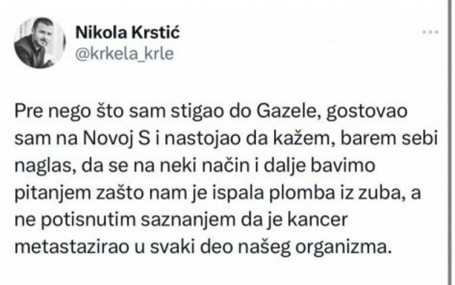 - Pre nego što sam stigao do Gazele, gostovao sam na Novoj S i nastojao da kažem, barem sebi naglas, da se na neki način i dalje bavimo pitanjem zašto nam je ispala plomba iz zuba, a ne potisnutim saznanjem da je kancer metastazirao u svaki deo našeg organizma - napisao je on.
