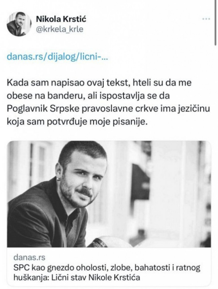 - Kada sam napisao ovaj tekst, hteli su da me obese na banderu, ali ispostavlja se da Poglavnik Srpske pravoslavne crkve ima jezičinu koja sam potvrđuje moje pisanije - napisao je ovaj promoter nemira u Srbiji.