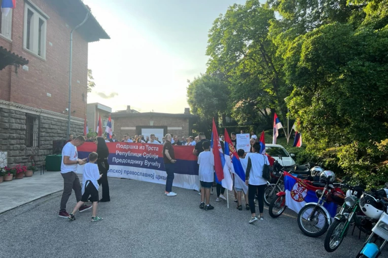 Takođe podrška je stigla i iz Trsta, a na transparentima je ispisano "Podrška iz Trsta Republici Srbiji, predsedniku Aleksandru Vučiću i Srpskoj Pravoslavnoj crkvi".