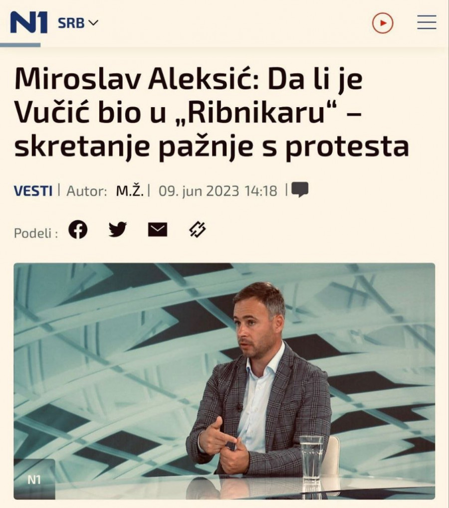 - To da li je Vučić bio u "Ribnikaru" ili ne, to nije tema, trebalo je da ode tamo transparentno. To je skretanje pažnje sa protesta protiv nasilja - kazao je za N1 Aleksić.