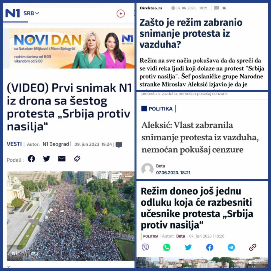 Šta se zatim desilo? Izveštavajući sa političkog protesta, N1 kao udarnu vest ima "Prvi snimak iz drona šestog protesta".