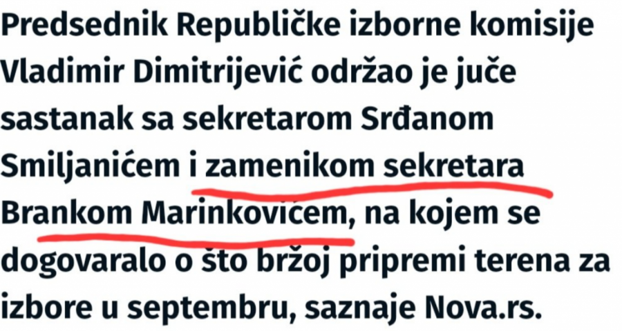 U tekstu se inače spominje da je sastanku prisustvovao zamenik sekretara Republičke izborne komisije Branko Marinković koji je preminuo krajem 2021. godine.
