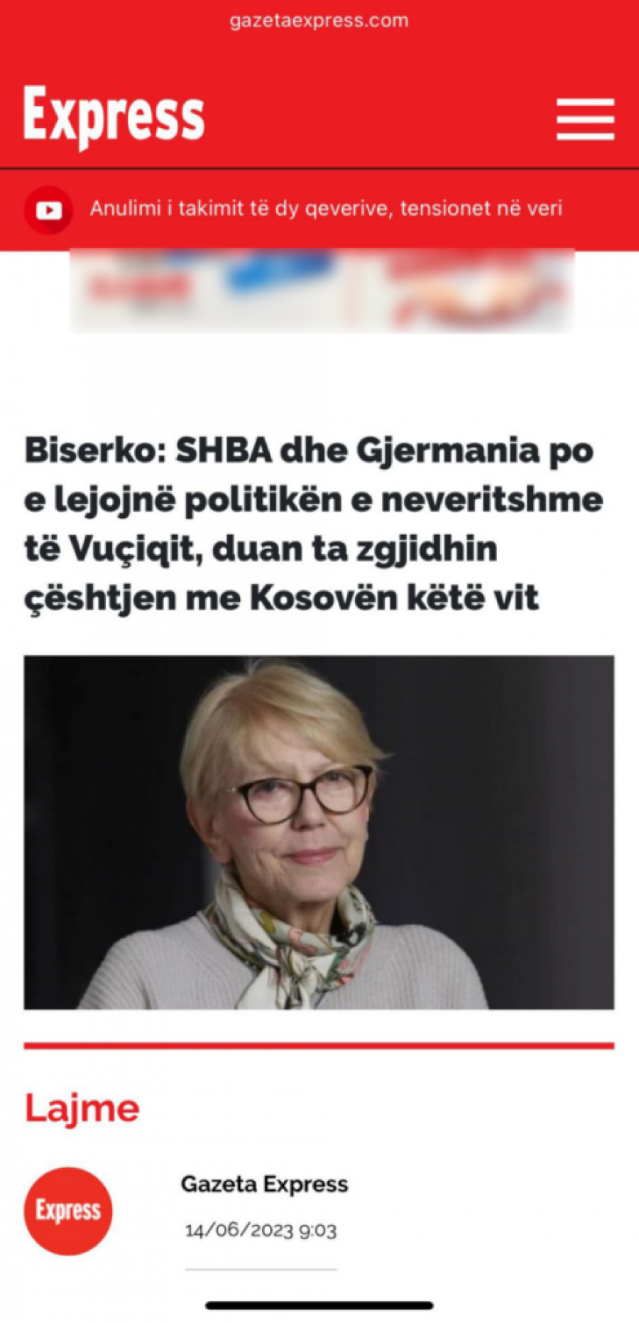 "Biserko: SAD i Nemačka dozvoljavaju Vučićevu odvratnu politiku, žele da reše pitanje sa Kosovom ove godine", naslov je ovog sramnog teksta u kojem se Biserko dodvorava Albancima.