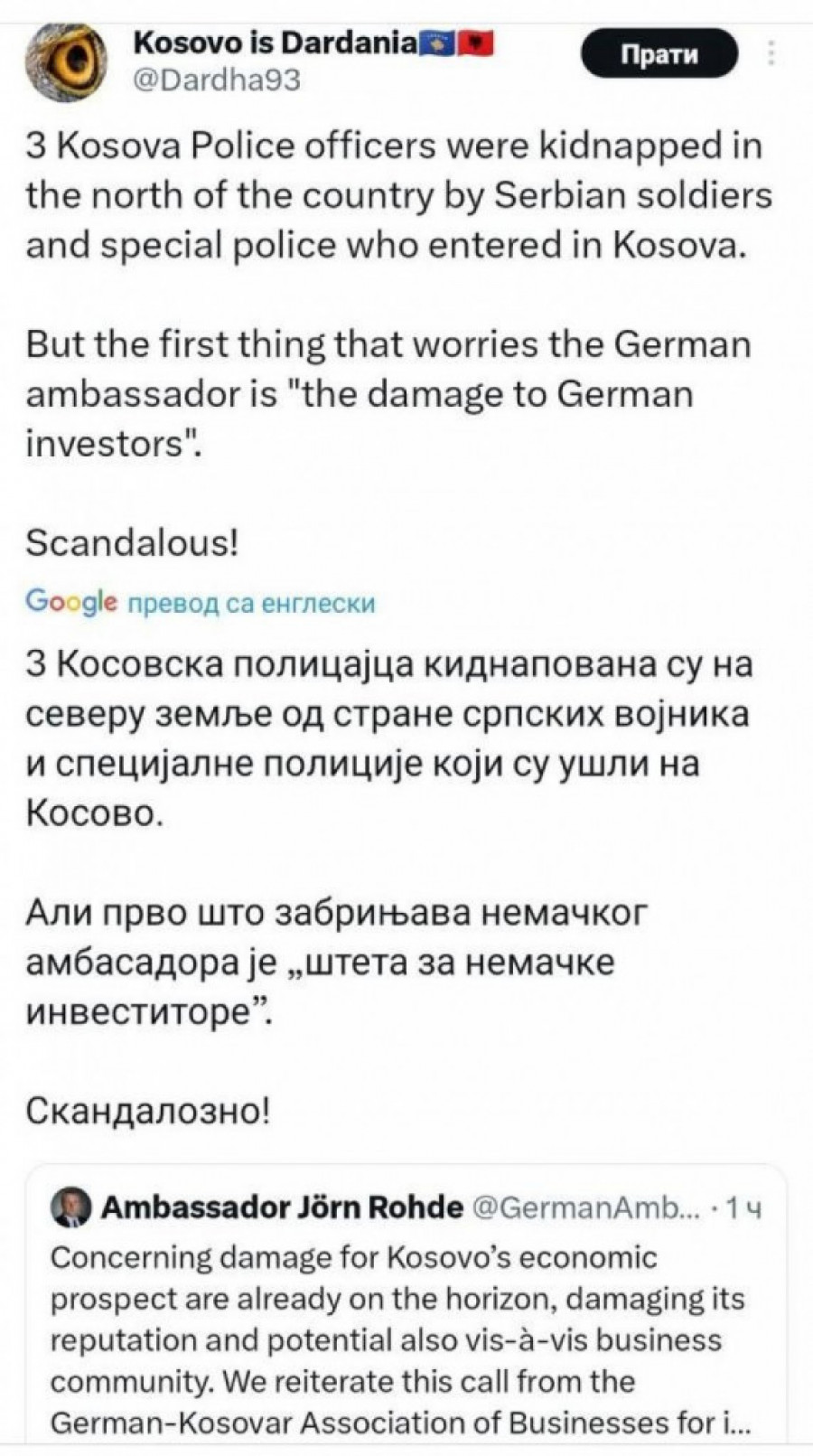 Naime, oni Jorna Rodea na Tviteru prozivaju zbog, kako kažu "skandalozne" izjave o šteti za nemačke investitore zbog ne smirivanja tenzija na Kosovu i Metohiji, izazvanih jednostranim potezima i provokacijama Aljbina Kurtija.