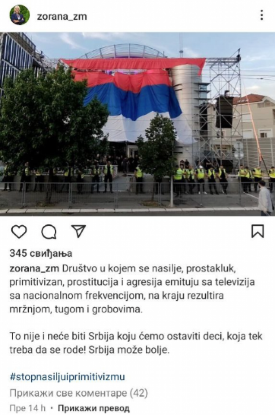 - Društvo u kojem se nasilje, prostakluk, primitivizam, prostitucija i agresija emituju sa televizija sa nacionalnom frekvencijom, na kraju rezultira mržnjom, tugom i grobovima. To nije i neće biti Srbija koju ćemo ostaviti deci, koja tek treba da se rode. Srbija može bolje - napisala je bivša ministarka i visoka funkcionerka SNS na Instagramu.