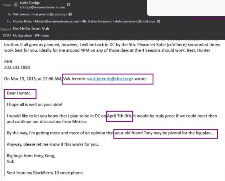 U vezi sa tim, pojavio se i mejl lidera Narodne stranke Vuka Jeremića kojim potvrđuje da su se on i Hanter Bajden i viđali u Meksiku i pravili poslovne dilove.
