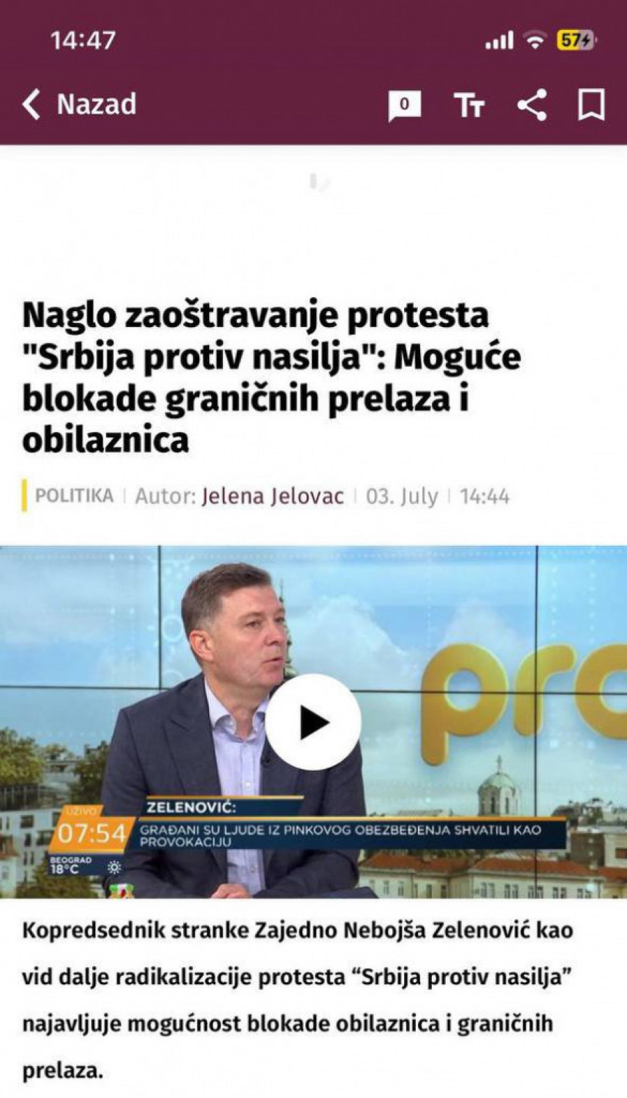 - Strategija postoji, ona je vrlo jednostavna i vi možete da je vidite iz sedmice u sedmicu. Verujem da su blokade dobar put. Mi smo sad imali blokadu auto-puta. Sledeći put to možemo da uradimo i na obilaznicama, možemo da krenemo prema graničnim prelazima. Ja verujem da je to dobar put. Tu su poslanici koji mogu da podnesu taj teret odgovornosti. Pominjao je Vučić juče da je to krivično delo. Evo, pošaljite mi krivičnu prijavu, da vidim da je to krivično delo kad vozite usporeno na auto-putu - rekao je Zelenović u emisiji "Probudi se" na televiziji Nova S.