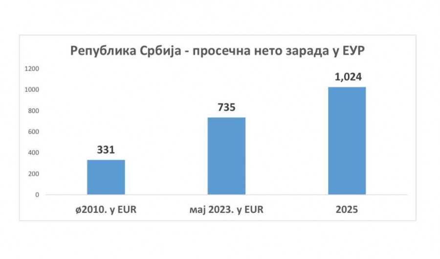 Predsednik Republike Srbije Aleksandar Vučić izjavio je danas, gostujući na TV Prva, da će prosečna zarada u Srbiji 2025. godine iznositi 1.024 evra, a u Beogradu oko 1.200 evra i više od toga.