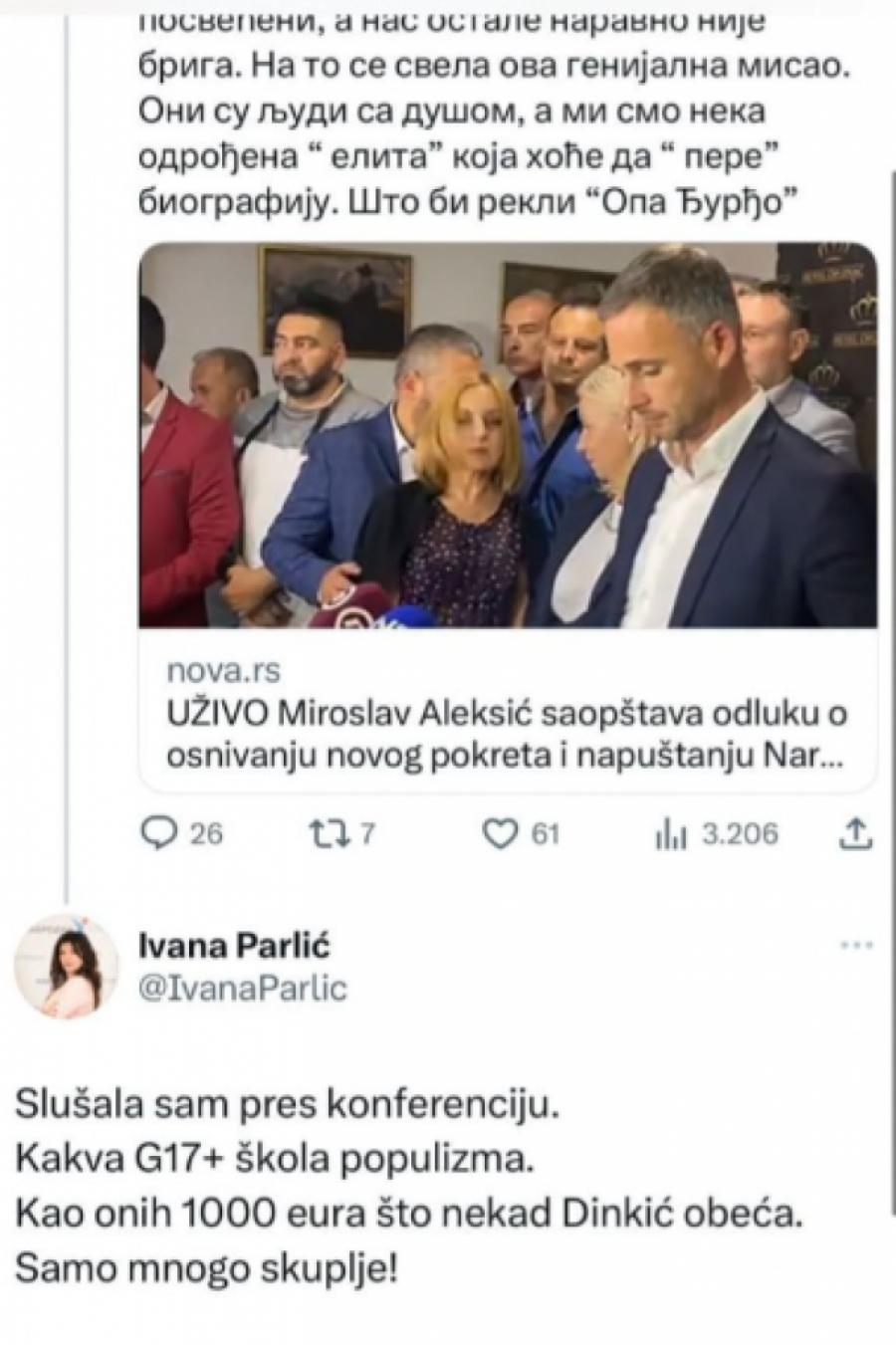 - Slušala sam pres konferenciju. Kakva G17+ škola populizma. Kao onih 1.000 evra što Dinkić nekad obeća. Samo mnogo skuplje! - poručila je Ivana Parlić putem Tvitera.