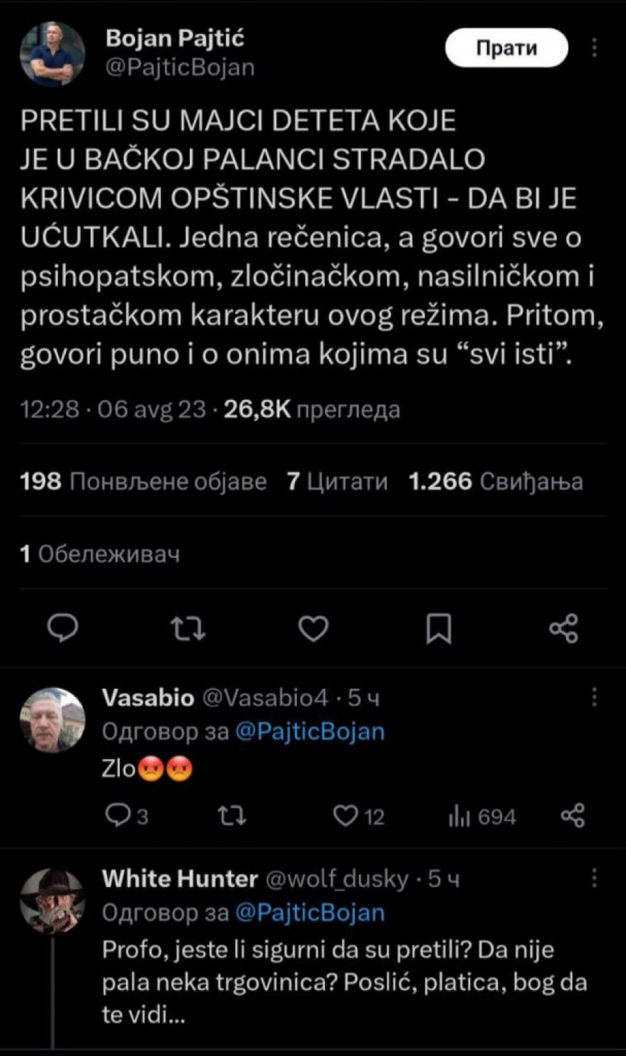 Nedostatak morala, empatije i zdravog rasuđivanja kod bivšeg predsenika DS Bojana Pajtića postaje sve izraženije. Da bi izazvao pažnju na društvenim mrežama on optužuje roditelje koji su izgubili dete da im se preti, a da su oni, uprkos najgoroj sudbini, odlučili da se nagode.