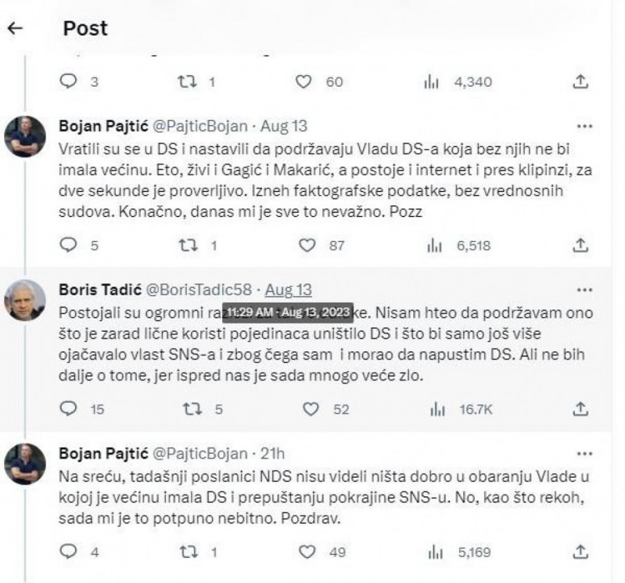 - Odluka NDS je bila da "ne budu ni u vlasti ni u opoziciji", što je, praktično značilo da sruše pokrajinsku Vladu u kojoj je DS imao većinu. Nakon toga su Gagić i Makarić iz NDS zamolili da dođu kod mene i rekli, parafraziram "Boris traži da ne podržimo Vladu čiji si ti predsednik, mi smo izabrani na listi čiji si ti nosilac i smatramo da to nije korektno. DS smo napustili zbog Đilasa, ne zbog tebe". Vratili su se u DS i nastavili da podržavaju Vladu DS-a koja bez njih ne bi imala većinu. Eto, živi i Gagić i Makarić, a postoje i internet i pres klipinzi, za dve sekunde je proverljivo. Izneh faktografske podatke, bez vrednosnih sudova. Konačno, danas mi je sve to nevažno. Pozz - napisao je Pajtić, na šta mu je Boris Tadić odgovorio: