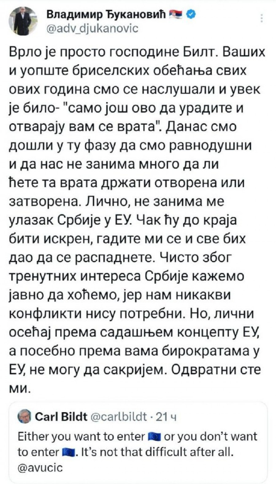 Vladimir Đukanović je oštro kritikovao Karla Bildta, istaknutog evropskog političara, i izrazio svoje duboko negativno mišljenje prema Evropskoj uniji (EU). Đukanović, poznat po svojim oštrim izjavama, nije štedeo reči dok je delio svoje nezadovoljstvo i gađenje prema onome što smatra neispunjenim obećanjima i nedelima vodećih evropskih lidera.