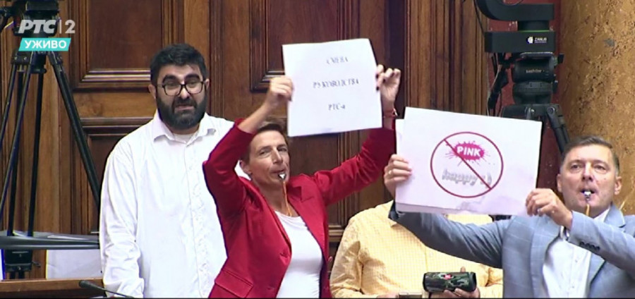 Međutim, možda najstrašnija scena dogodila se kada je narodni poslanik Jarhja Fehretović uzeo reč i počeo da priča o važnosti izdvajanja za bolesnu decu, uz reči da i sam ima bolesno dete, a Dragana Rakić, poslanica DS, stala je ispred njega i počela da duva u pištaljku i širi transparent- smena rukovodstva RTS.