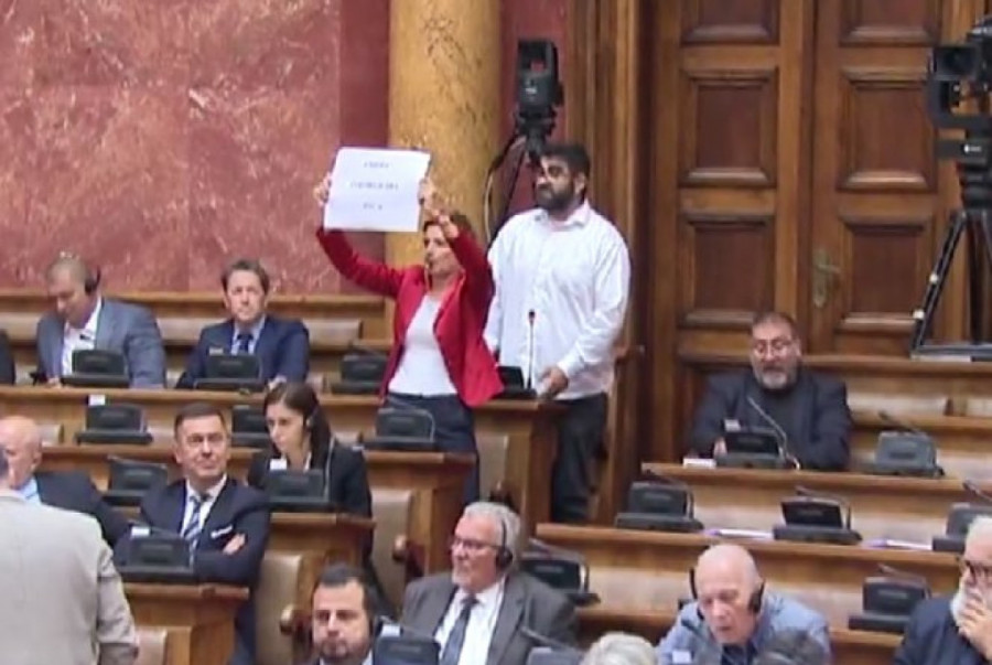 Fehratović je počeo izlaganje da je odvajanje novca za teško bolesnu decu dobra inicijativa, te da i sam ima teško bolesno dete, a onda, kako se vidi na snimku, ispred njega staje Dragana Rakić, poslanica DS, i kreće da duva u pištaljku iz sve snage uz rašireni transparent.
