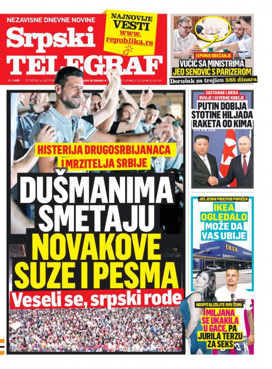 Srpski telegraf u štampanom izdanju za četvrtak 14. septembar donosi pregršt važnih i interesantnih priča.