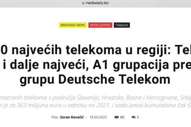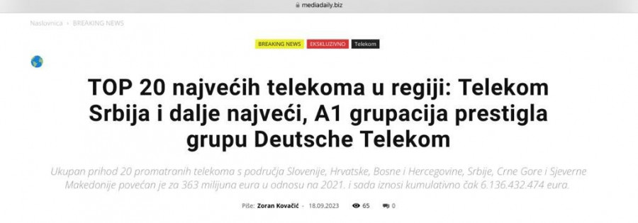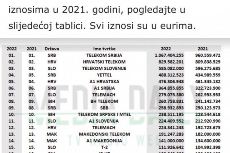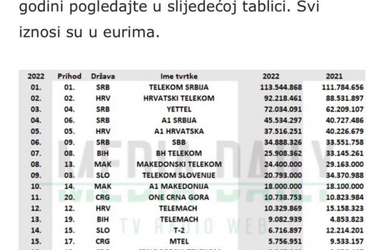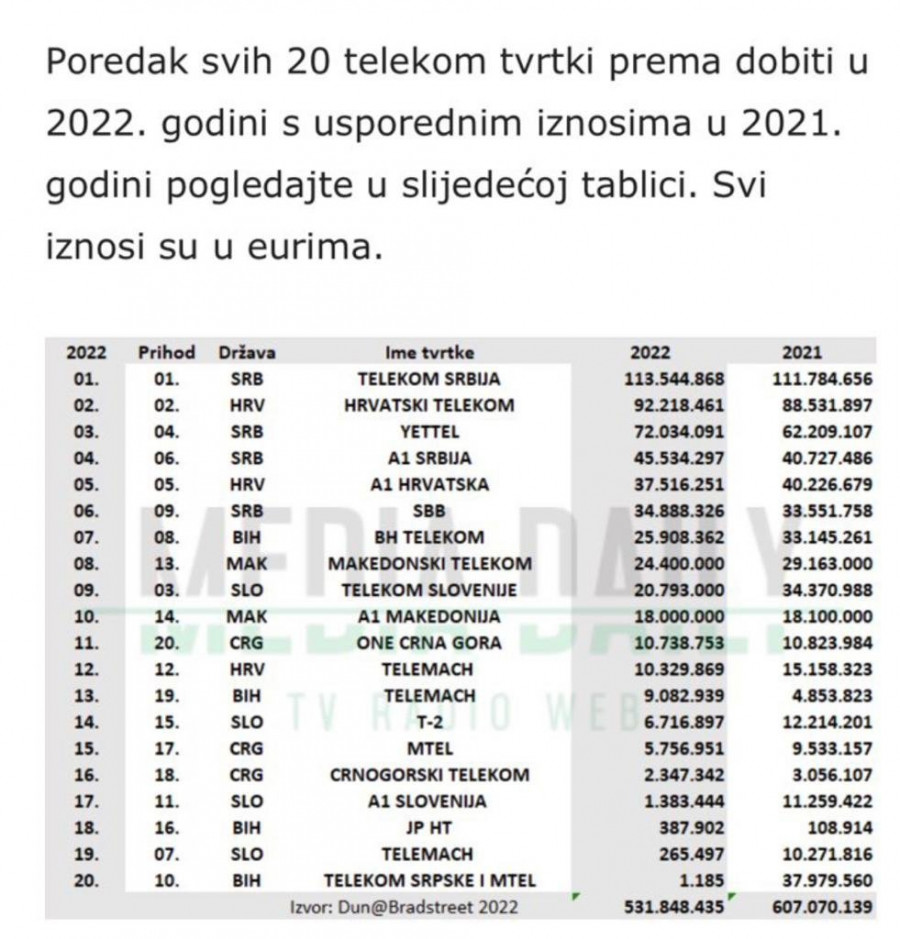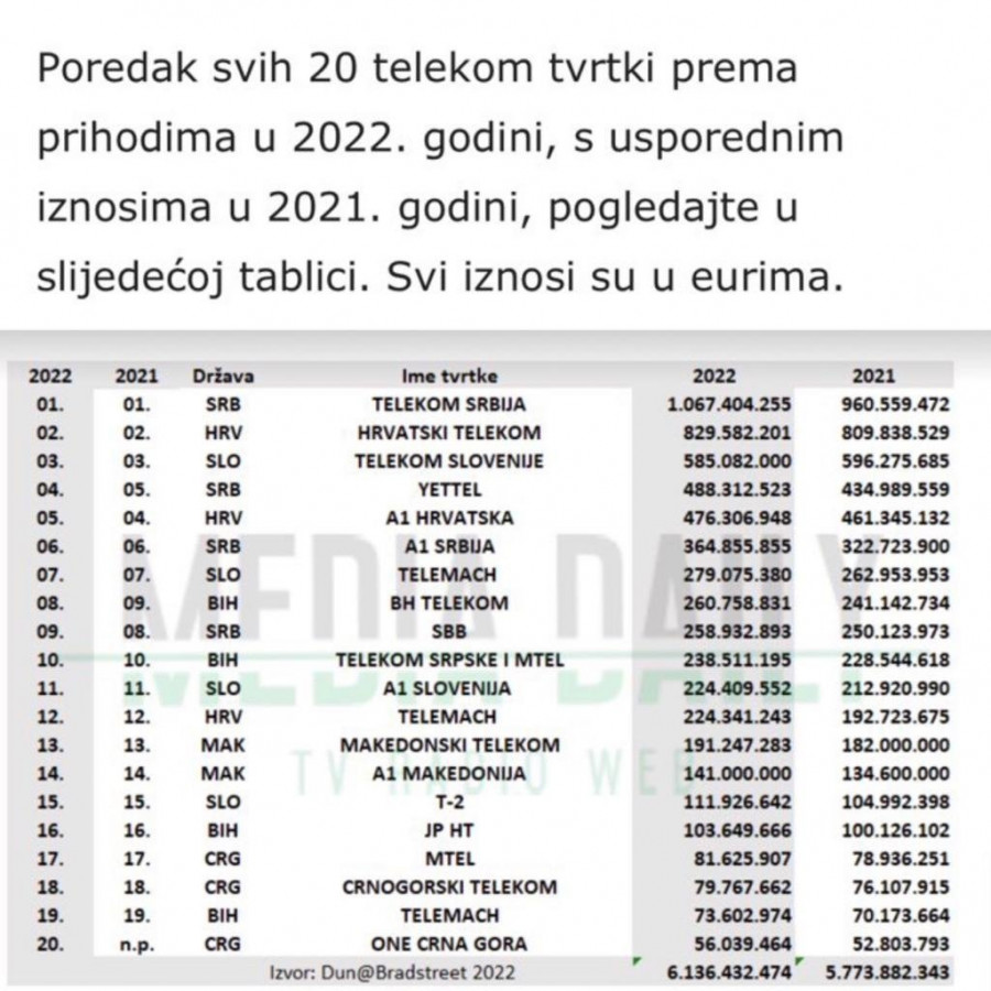 Ugledni hrvatski portal “Media Daily”, specijalizovan za dešavanja u industrijama medija i telekomunikacija, objavio je svoju redovnu analizu poslovanja 20 najvećih operatera u regionu, a drugu godinu zaredom ubedljivo na prvom mestu - i po prihodima i po dobiti - nalazi se kompanija Telekom Srbija!