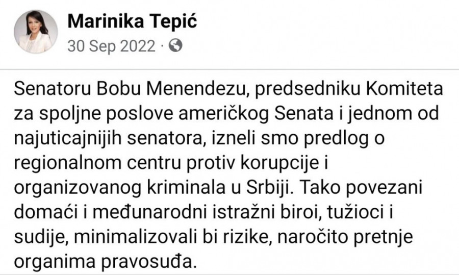 - Senator Bobu Menendezu, predsedniku Komiteta za spoljne poslove američkog Senata i jednom od najuticajnijih senatora, izneli smo predlog o regionalnom centru protiv korupcije i organizovanog kriminala u Srbiji. Tako povezani domaći i međunarodni istražni biroi, tužioci i sudije, minimalizovali bi rizike, naročito pretnje organima pravosuđa - objavila je Marinika Tepić.