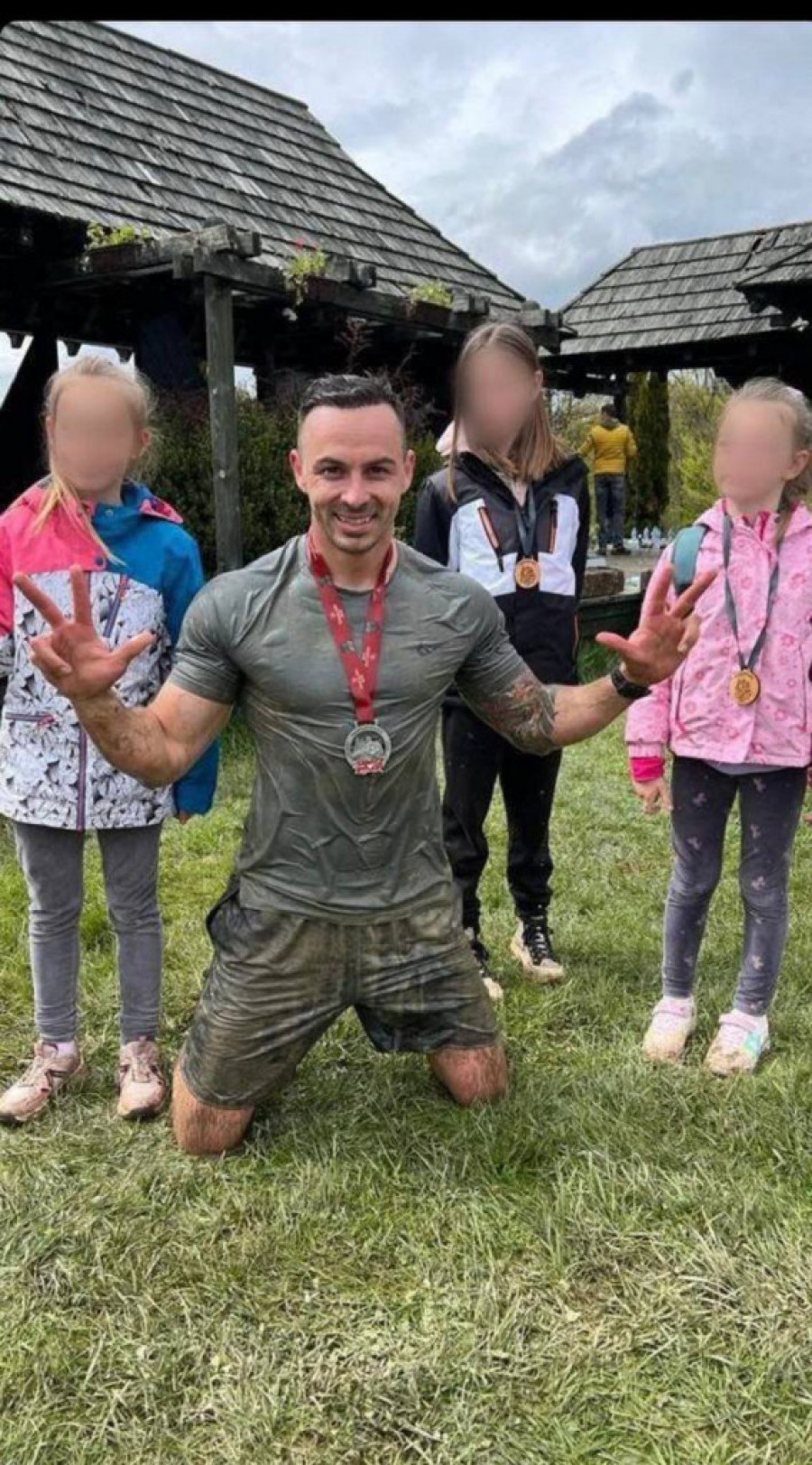 Na jednoj Stefan ponosno sa tri podignuta prsta, nasmejan pozira sa ćerkicama. Na grudima okačene medalje.