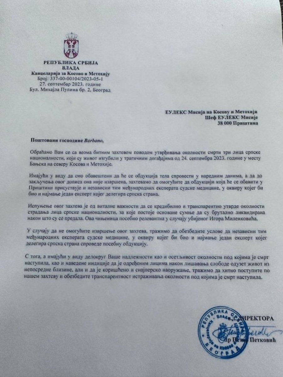 Direktor Kancelarije za Kosovo i Metohiju uputio je EULEKSU pismo u kom zahteva da obdukciji tela Srba, ubijenih u oružanom sukobu u Banjskoj, prisustvuje i tim nezavisnih eksperata sudske medicine, a sve u cilju sprečavanja onoga što Priština pokušava, da sakrije istinu o tome da su oni brutalno likvidirani!