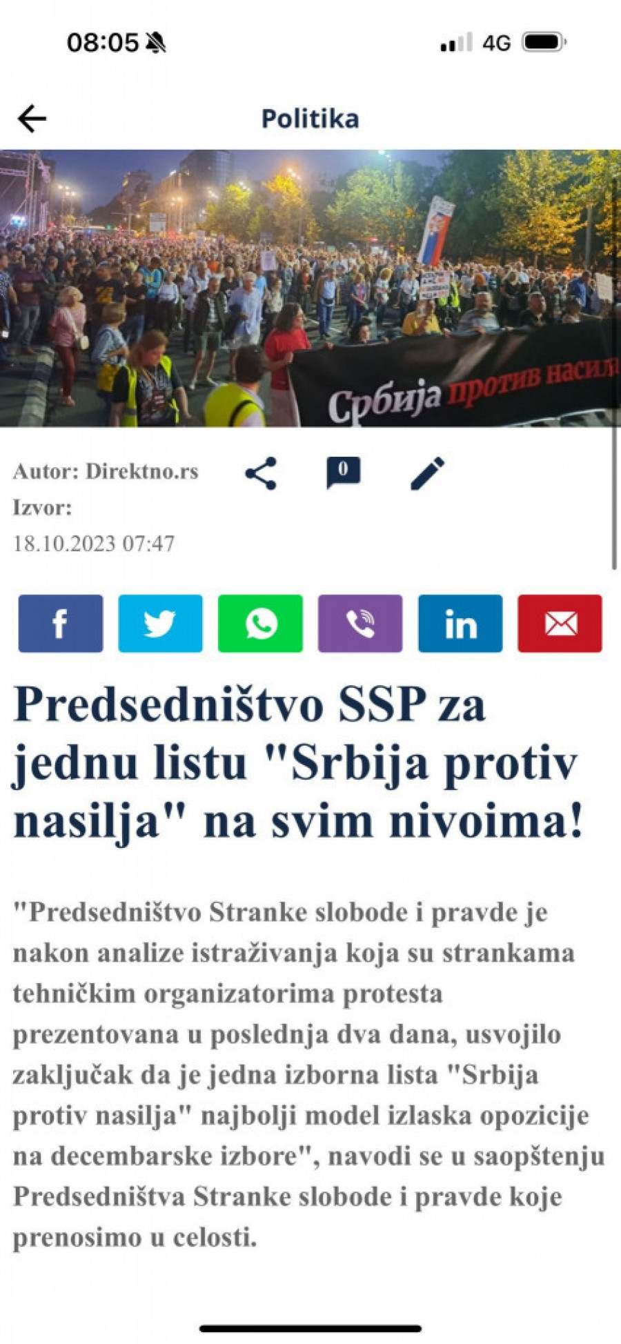 Naime, Predsedništvo Stranke slobode i pravde usvojilo zaključak da je jedna izborna lista „Srbija protiv nasilja“, kako navode, „najbolji model izlaska opozicije na decembarske izbore“. Kako dodaju, u istom formatu neophodno je izaći i na pokrajinske, beogradske i lokalne izbore.