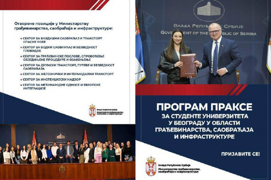 - Ministarstvo građevinarstva, saobraćaja i infrastrukture (MGSI), zajedno sa Univerzitetom u Beogradu, raspisali smo konkurs za prijem novih 150 studenata BU koji će na taj način pohađati stručnu praksu tako i u preduzećima koja rade u okviru našeg Ministarstva i tako steknu neprocenjivo iskustvo radeći na najznačajnijim infrastrukturnim projektima - rekao je ministar Goran Vesić.