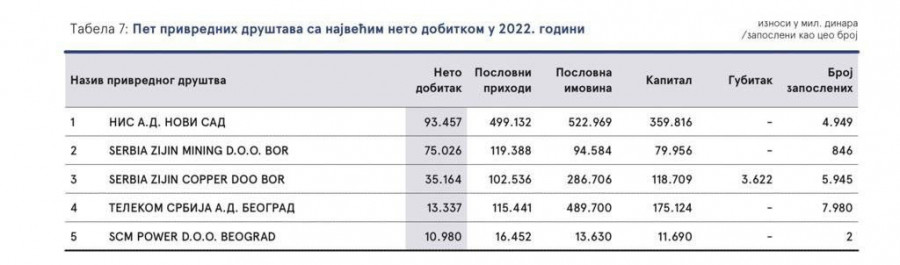 U izveštaju “Sto naj… privrednih društava” za 2022. godinu, navodi se da je srpski Telekom ukupno četvrti po ostvarenoj neto dobiti, posle NIS-a, Ziđin Majning i Ziđin Koper, koji su u stranom vlasništvu.