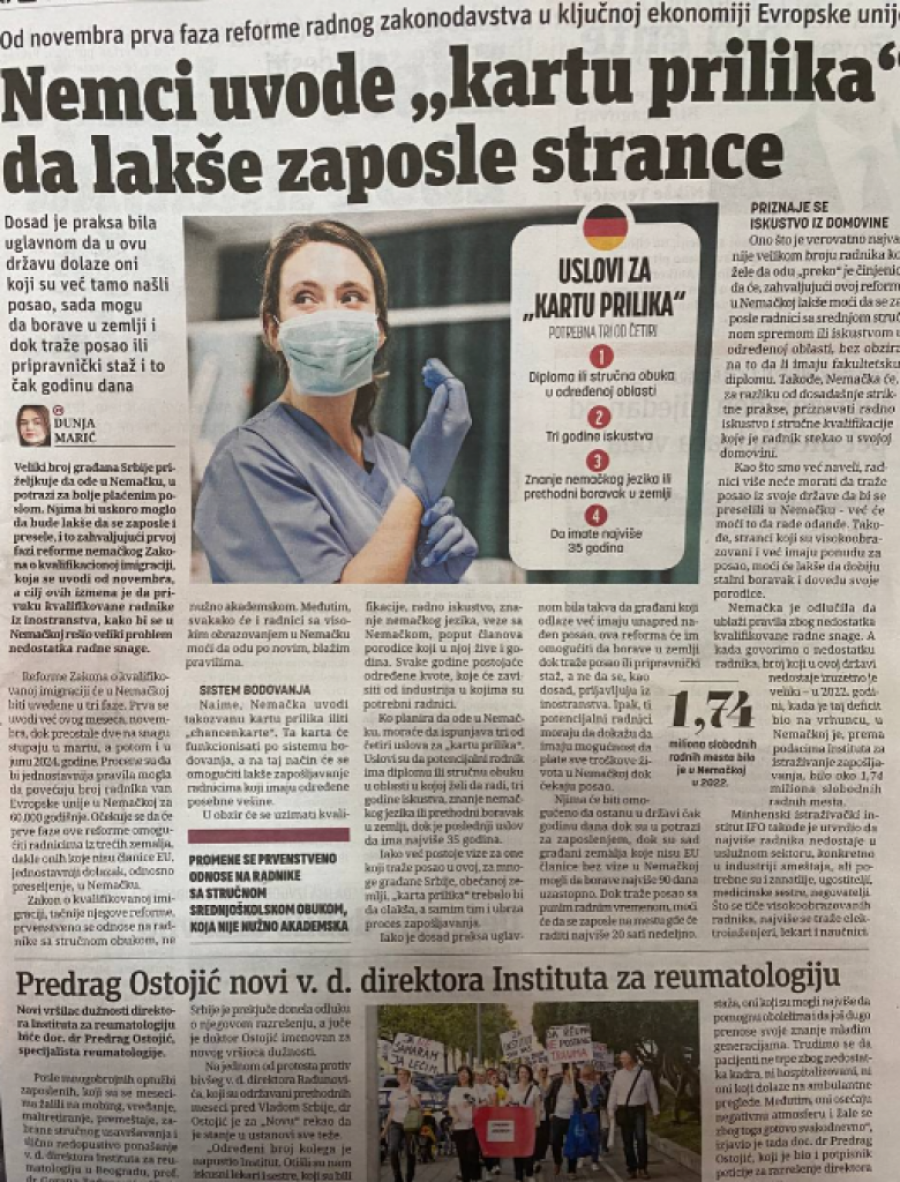 Ovaj tekst sugeriše da se veliki broj građana Srbije upušta u odlazak u Nemačku u potrazi za boljim životom. Medij naklonjen opoziciji tvrdi da se dosad praksa uglavnom svodila na dolazak u ovu državu onih koji su već pronašli posao tamo, ali da će, zahvaljujući novoj fazi reforme nemačkog Zakona o kvalifikacionoj imigraciji, osobe moći da borave u Nemačkoj dok traže posao ili pripravničku praksu, čak i do godinu dana.