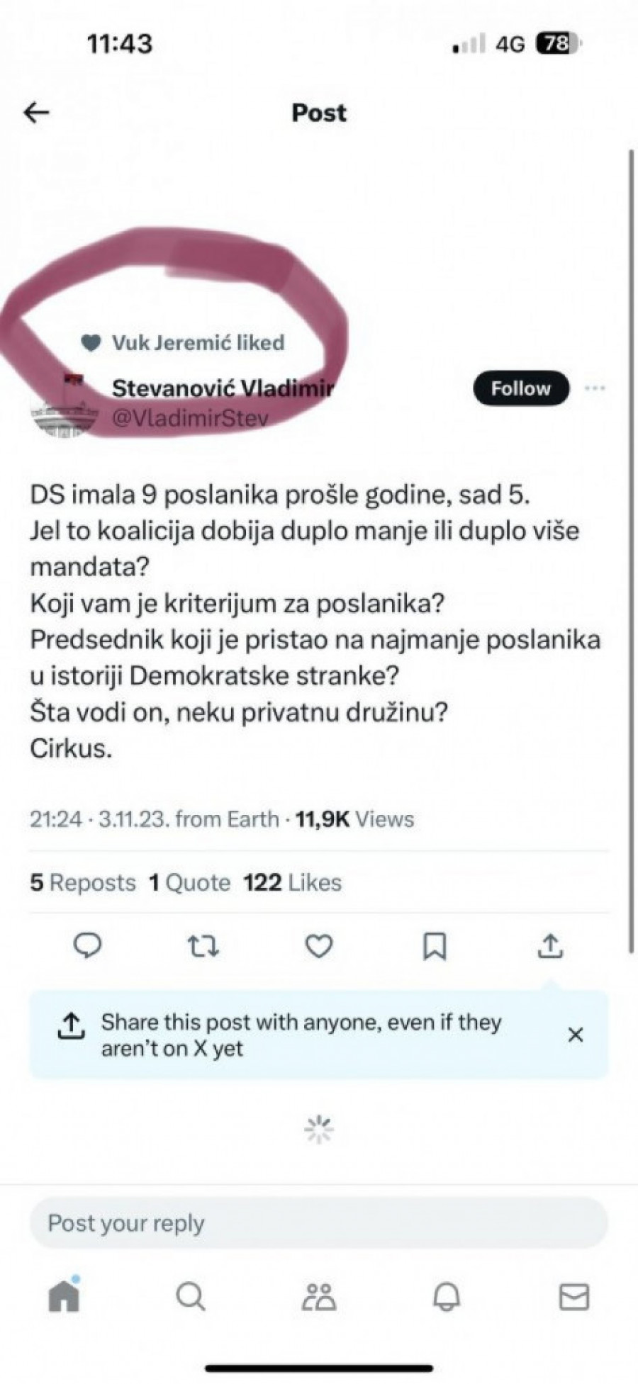 Lider Narodne stranke Vuk Jeremić lajkovao je objavu Vladimira Stevanovića na društvenoj mreži Iks u kojoj Stevanović navodi da je u DS cirkus.
