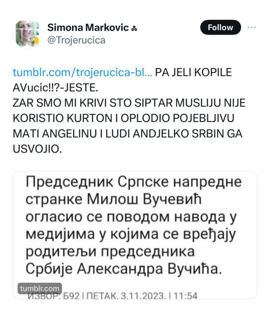 Oštra kritika na društvenim mrežama često je sastavni deo političkog diskursa, ali poslednjih dana se pojavio talas uvredljivih komentara koji su prevazišli granice uobičajenog političkog dijaloga. U mnogim tweetovima, predsednik Vučić je izložen vređanju, omalovažavanju i pretnjama njegove porodice.