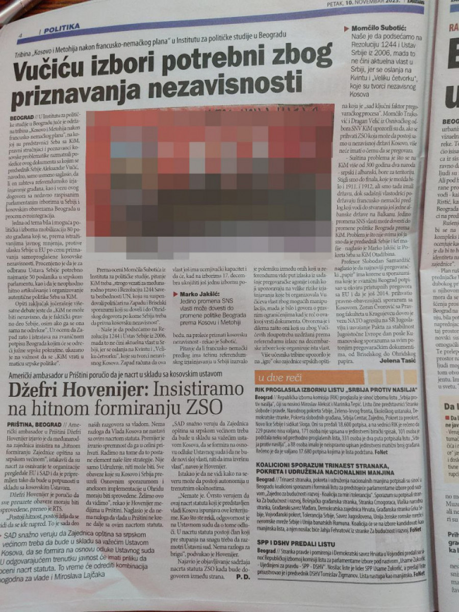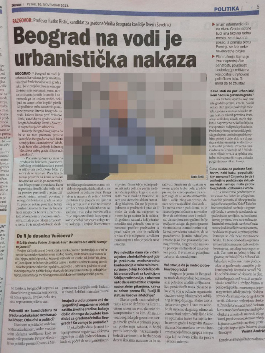 Kad je ovakva naslovna, nema sumnje šta je unutra. Kako listate novine samo se smenjuju tekstovi- "Vučiću izbori potrebni zbog priznavanja nezavisnosti", "Beograd na vodi je urbanistička nakaza", "Prekobrojne grupe, loši uslovi rada i niske plate", "Sramno i politički instruisano iz SNS", "Vučić u TV gostovanju najavljen kao predsedni, ali govorio o izborima", "Rekla sam ono što svi znaju, car je odavno go", ""Poštar" koji sve duguje Vučiću"......