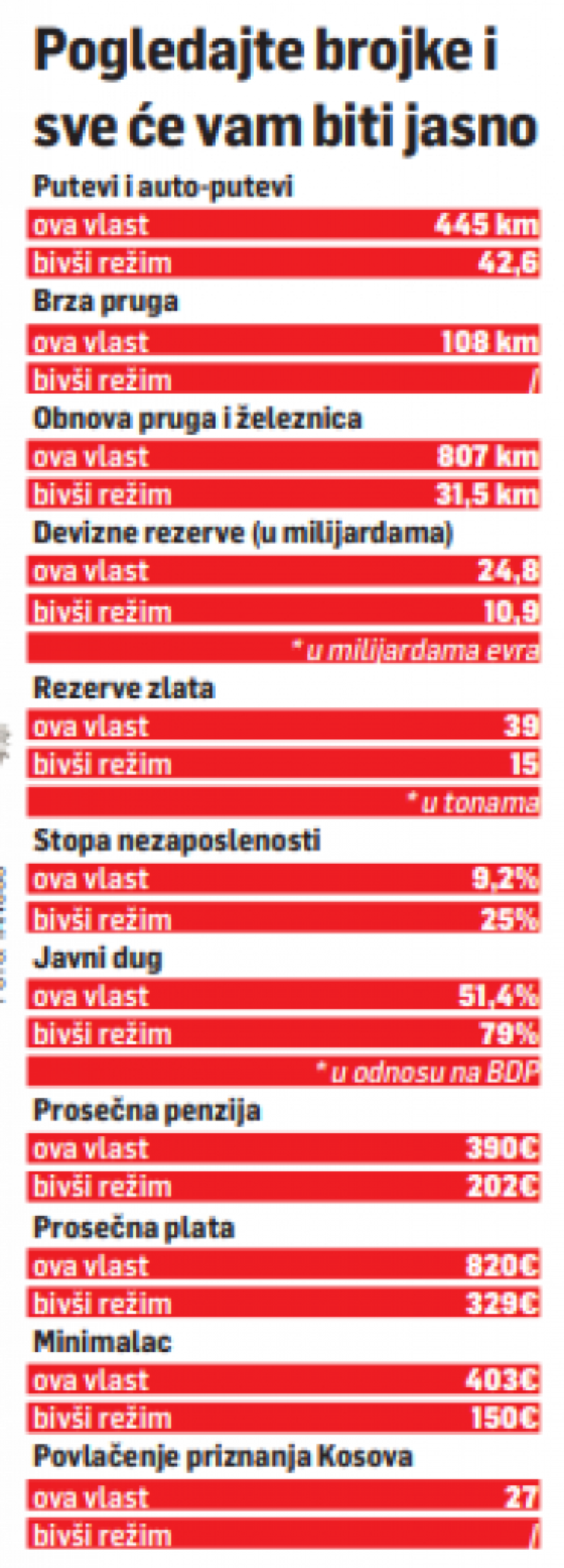 Brojke govore dovoljno - dva i po puta veće plate nego pre 11 godina, gotovo 50 odsto veće penzije, deset puta više izgrađenih kilometara auto-puteva, milioni evra za bolnice, muzeje, škole...