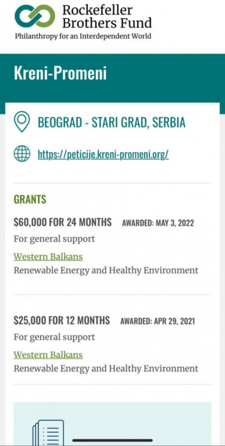 Ipak, vođa organizacije “Kreni-promeni” javno pokušava da se distancira od svog nekadašnjeg stranačkog angažmana, jer mu se aktivizam u nevladinom sektoru itekako isplati. Naime, već je odavno poznato da je “Kreni-promeni” na platnom spisku Rokfelerovog fonda, o čemu svedoči i donacija od masnih 60.000 dolara što je objavljeno na zvaničnom sajtu fondacije Braće Rokfeler.
