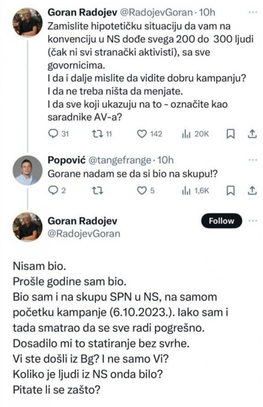 - Zamislite hipotetičku situaciju da vam na konvenciju u NS dođe svega 200 do 300 ljudi (čak ni svi stranački aktivisti), sa sve govornicima. I da i dalje mislite da vidite dobru kampanju? I da ne treba ništa da menjate. I da sve koji ukazuju na to – označite kao saradnike AV-a - napisao je Radojev i upitao se koliko je zapravo ljudi bilo iz Novog Sada, a koliko je dovučeno, primera radi, iz Beograda.