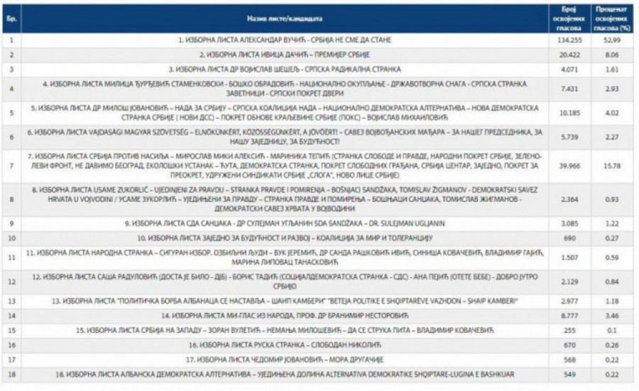 Ovi preliminarni rezultati snažno ukazuju na ubedljivu podršku listi "Aleksandar Vučić - Srbija ne sme da stane". Konačni rezultati će biti potvrđeni nakon što budu obrađeni svi glasovi i završen ceo izborni proces.