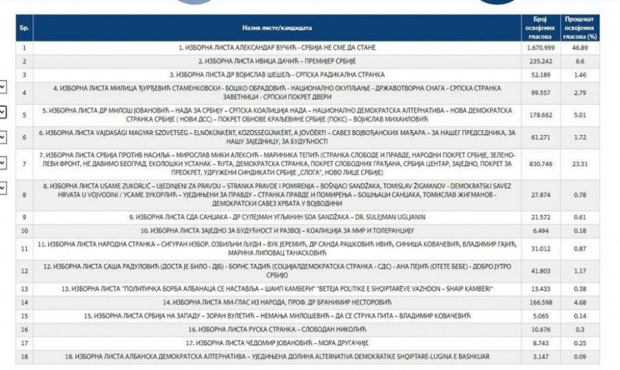 Apsolutnu većinu ima Izborna lista Aleksandar Vučić - Srbija ne sme da stane.